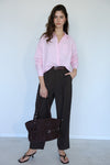 הפריט שיעניק למלתחה שלך פרשנות נשית, מודרנית ובעלת טעם. חולצת ויטוריה מעוצבת בגזרת כפתרה קלאסית ומחויטת קלות, עם צווארון חד וכיס צדדי פונקציונלי. היא עשויה מבד כותנה איכותי ונעים, בגוון ורוד פסטל רך, הכולל טקסטורת פסים צפופה ודקיקה בגוון שוקולד עמוק שמוסיף תחכום. פריט ורסטילי להפליא שעובר בטבעיות מבוקר במשרד (מעל מכנסיים מחויטים)או לערב קליל בחוץ (עם ג'ינס גבוה).