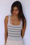 גופיית סטרייפס סרוגה עם מחשוף ריבועי מחמיא שמכניס שיק לכל לוק. הבד האיכותיי נצמד לגוף בצורה מחטבת ונוחה, ומשלבת פסים בגווני אבן וסייג'. מושלמת לשילוב יומיומי עם ג’ינס או שורט בהיר ללוק מדויק עם אפס מאמץ.