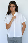 חולצת כפתורים קלאסית בגזרה משוחררת, עשויה מבד ויסקוזה וכותנה אוורירי ונשפך למראה נקי ומעודן.הקווים מינימליסטיים, עם צווארון חד, שרוול קצר מעט רחב ושוליים ישרים  היוצר שילוב מדויק של אלגנטיות ורפיון מודרני. פריט מפתח במלתחה הקיצית, שיתאים למכנס מחויט לעבודה או עם שורט פשתן ליומים – effortless chic במיטבו