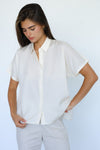 חולצת כפתורים קלאסית בגזרה משוחררת, עשויה מבד ויסקוזה וכותנה אוורירי ונשפך למראה נקי ומעודן.הקווים מינימליסטיים, עם צווארון חד, שרוול קצר מעט רחב ושוליים ישרים  היוצר שילוב מדויק של אלגנטיות ורפיון מודרני. פריט מפתח במלתחה הקיצית, שיתאים למכנס מחויט לעבודה או עם שורט פשתן ליומים – effortless chic במיטבו