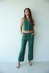 סט ווסט ומכנסיים מ100% כותנה - הווסט בצבע ירוק מטריף בשילוב שלושה כפתורי עץ ומכנסיים בגזרה נמוכה באורך 7/8 בשילוב שני כיסים, ניתן לרכוש אותם גם בנפרד.