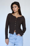 קרדיגן סריג קלאסי בגוון קקאו עמוק, עשוי סריג רך ונעים מבד כייפי ומלטף בשילוב כפתורי זהב מט בחלקו הקדמי. שלבי עם ג׳ינס מוניקה למקסימום קאז׳ואלנס.