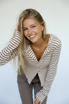 קרדיגן מבד ריב קליל באורך מותן עם כפתורים לאורך החלק הקדמי. מגיע בדוגמת פסים בצבע בורדו על רקע קרם, בגזרה מחמיאה שמתאימה מעל גופייה, טי-שירט או פשוט כמו שהוא.