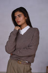 סריג בייסיק, בגזרה משוחררת, בשילוב צווארון בצורת וי לא ממש עמוק ומנג׳ט במותן. עשוי מבד צמר איכותי ונעים למגע