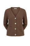 קרדיגן בייסיק מבד עבה ואיכותי בגזרת וי עמוק בגוון שוקולד חמים. לקרדיגן כפתורים בולטים והגזרה ישרה ומדוייקת